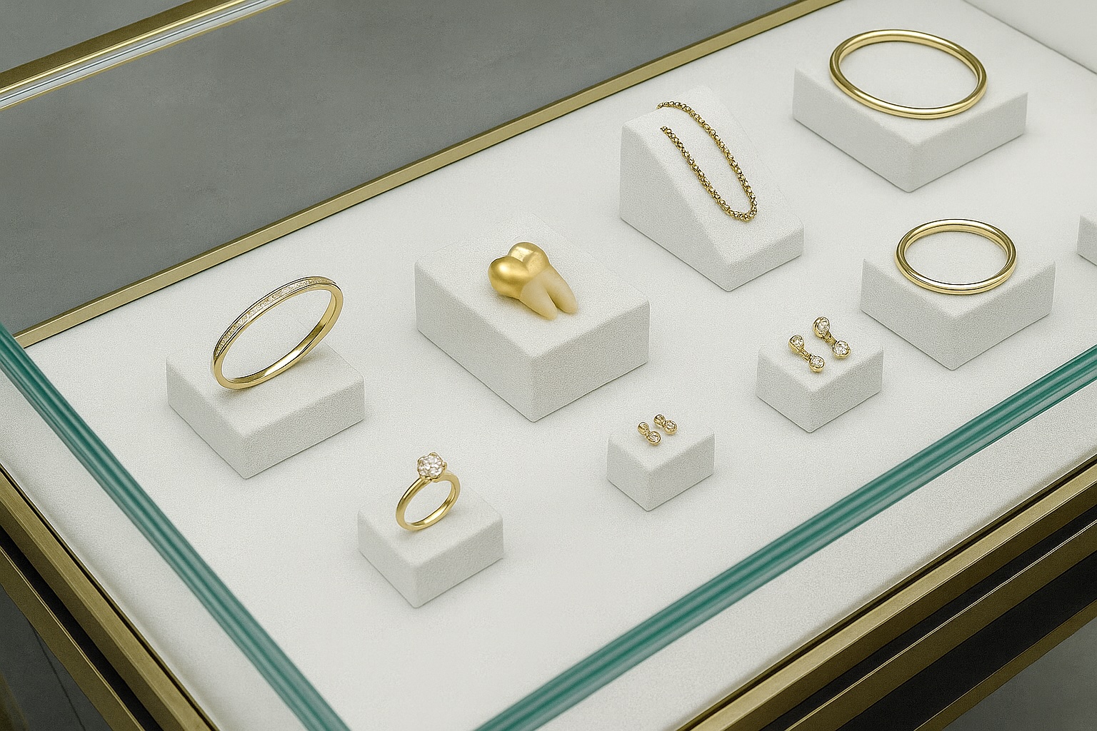 the work „5 grams“ presents a gold tooth next to gold jewellery in a showcase. it does not address the victim himself, but the coldness of a system that sought profit even in death. the showcase, a symbol of desire and museum distance, makes the unspeakable visible and at the same time unbearable.